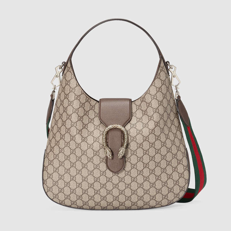 The Dionysus hobo with a tiger head closure referencing the Greek god Dionysus, who in myth is said to have crossed the river Tigris on a tiger sent to him by Zeus. The GG Supreme canvas is crafted from a coated microfiber fabric with the GG motif.