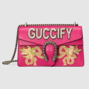 The Dionysus shoulder bag is enriched with a pearl effect "Guccify" applique. A play on the House name, the hand-beaded embroidery is contrasted by grosgrain floral bouquets. The now defining tiger head closure鈥攁 unique detail referencing the Greek god Dionysus, who in myth is said to have crossed the river Tigris on a tiger sent to him by Zeus鈥攊s further enhanced with Swarovski crystals. The sliding chain strap can be worn multiple ways, changing between a shoulder and a top handle bag.