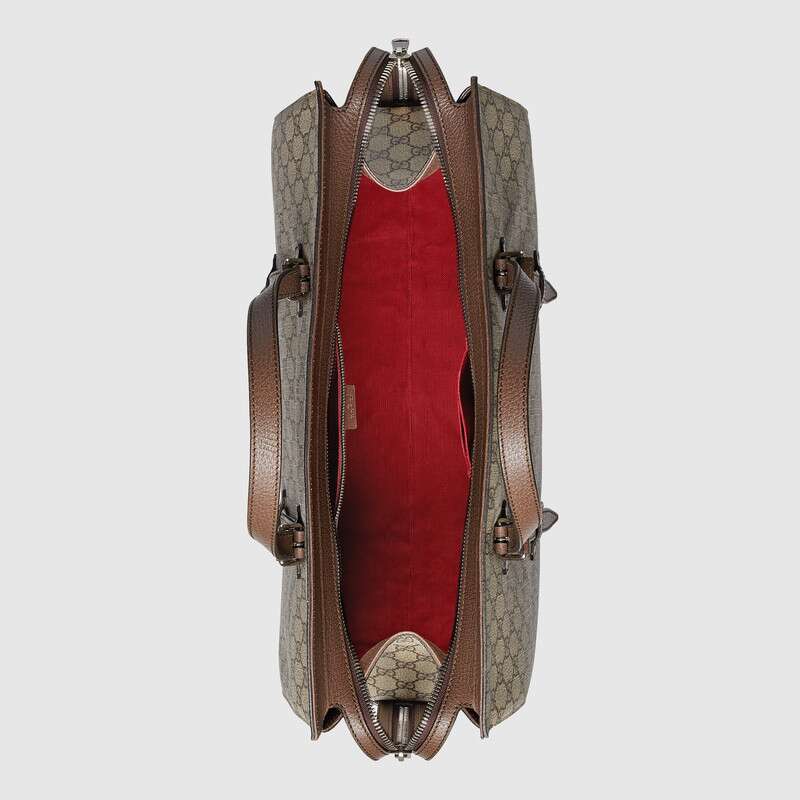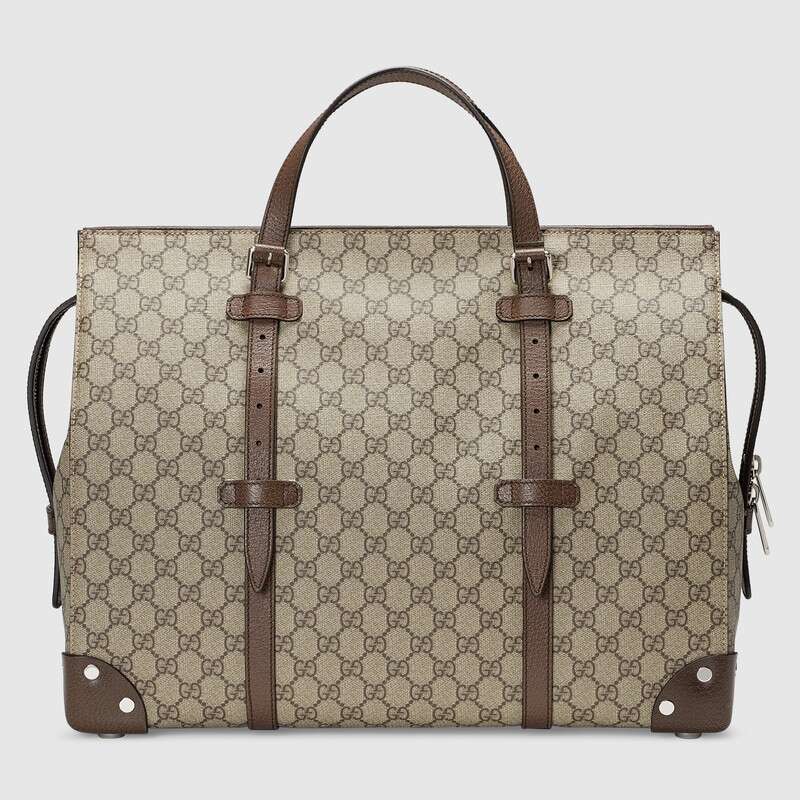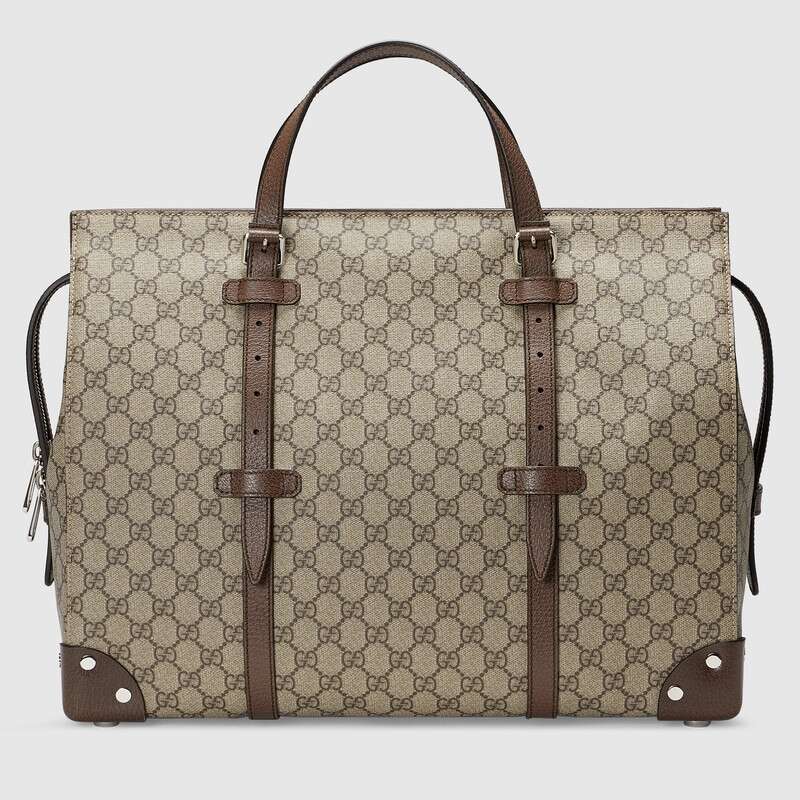 Inspired by vintage travel luggage, the GG Supreme duffle bag has a double handled shape and an extended zip-top closure. Reminiscent of traditional suitcases, the structured design is finished with leather corners and logo engraved metal feet. Pieces with versatile ways to wear and style embrace each person who is part of the House鈥檚 individual spirit.