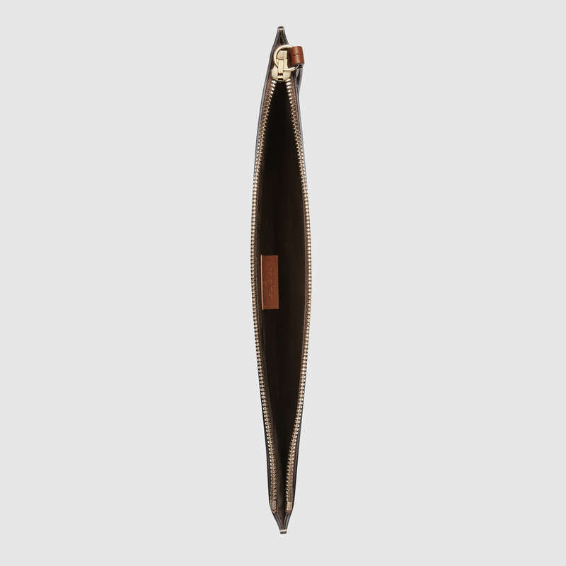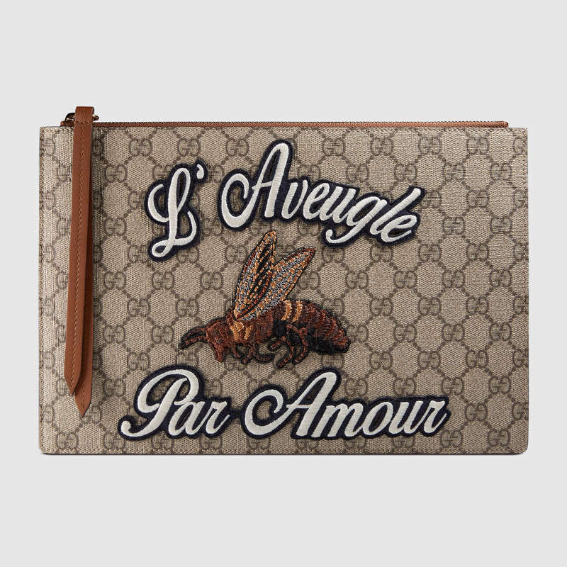 A GG Supreme canvas pouch with embroidered bee applique with the embroidered phrase "L鈥橝veugle Par Amour" which translates to 鈥淏lind For Love" on the side. The bee is an archival code first introduced in Gucci ready-to-wear in the 1970s.