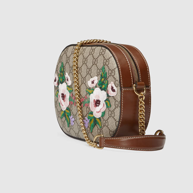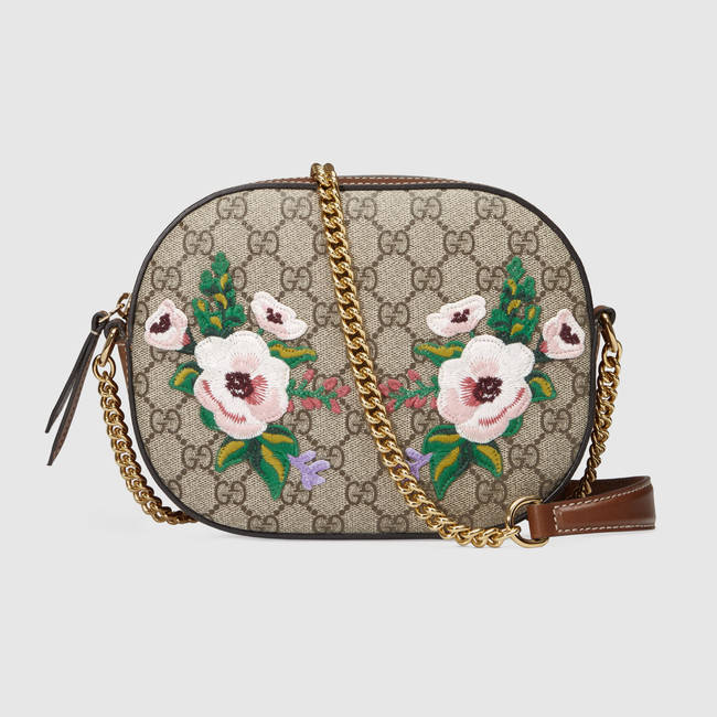Available exclusively on Gucci.com, this limited edition mini chain bag features embroidered birds and flower appliques.