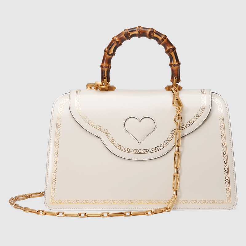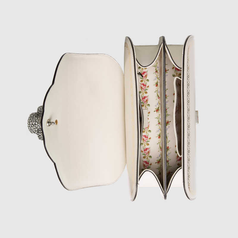 A structured top handle bag in glossy leather is enriched with a gold printed frame with an intricately braided pattern. The iconic bamboo handle is juxtaposed with the symbol of a roaring feline head, painted with colored enamel and encrusted with sparkling crystals and two stones at the eyes. The detachable chain strap allows the style to be worn as a shoulder bag. Each handbag will come with a small, pocket-sized book featuring a unique printed cover inspired by the collection. The book-"Juvenilia"-is a compilation of short stories written by English writer Jane Austen during her teenage years from 1787-1793, a time during which she was free from censorship or societal pressure. The creative chaos and the continuous contradictions which characterize the stories are the same pillars we witness in Gucci鈥檚 collections.
