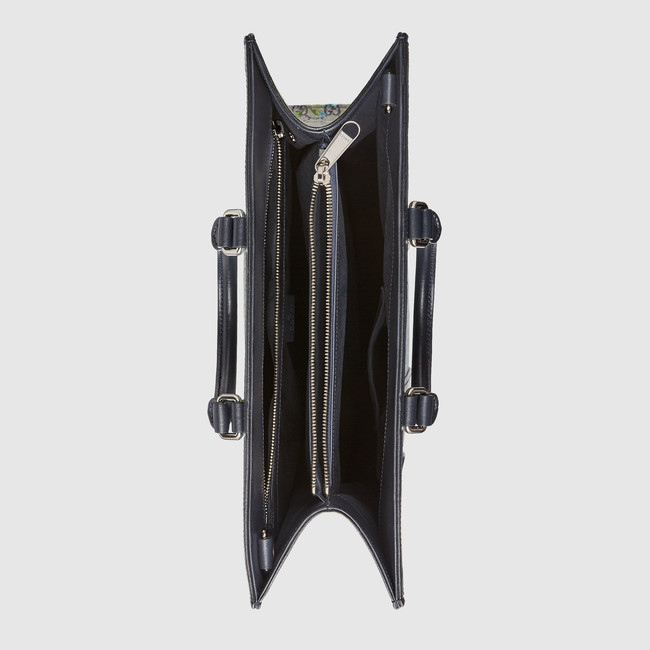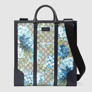 First appearing in the Fall Winter 2015 women's fashion show, our distinctive Blooms motif is presented for the first time in blue. The tapestry inspired print evokes the look of a canvas painting, printed on signature GG Supreme canvas in a structure tote shape.