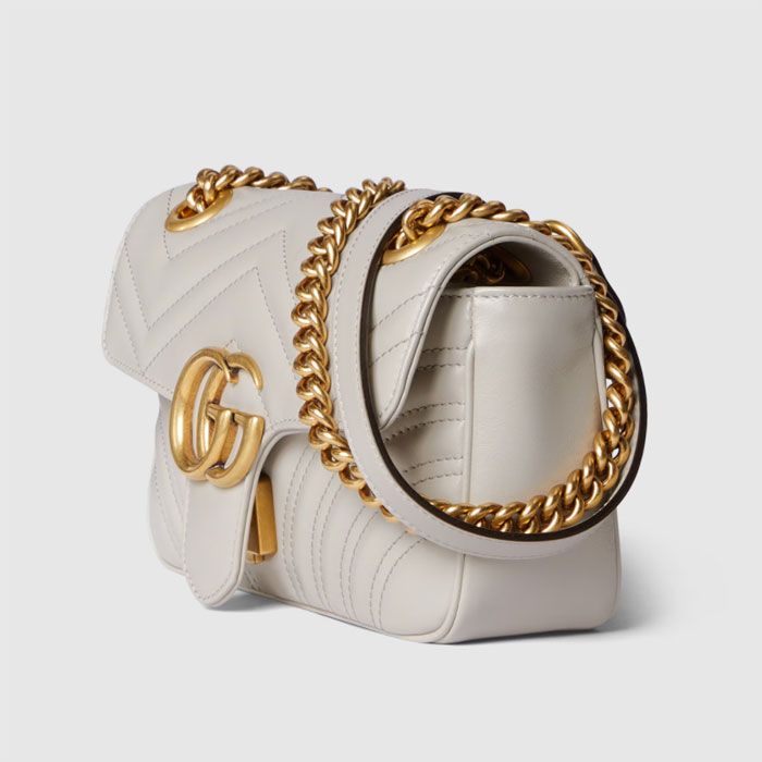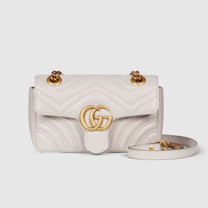 Made in matelasse chevron leather in a neutral shade of light grey, the now recognizable GG Marmont mini bag has a softly structured shape and a flap closure with Double G hardware. Designed to be worn multiple ways, the chain strap slides to change between a shoulder and a top handle bag.