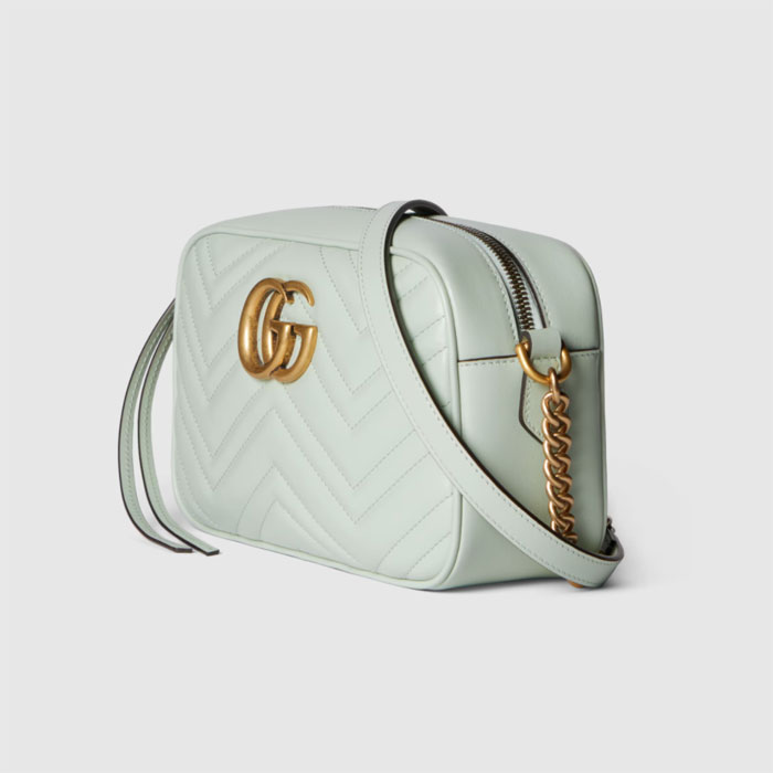 Made in matelasse chevron leather in a soft shade of pale green, the now recognizable GG Marmont small shoulder bag has a softly structured shape and a flap closure with Double G hardware.