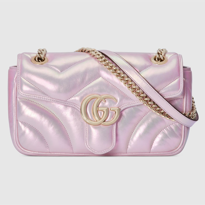 From day-time elegance to after-dark glamor, Gucci's most beloved handbag designs are reimagined in an eye-catching iridescent quilted leather. This GG Marmont small shoulder bag appears in a pink variation with a shiny gold-toned Double G hardware.