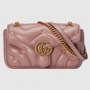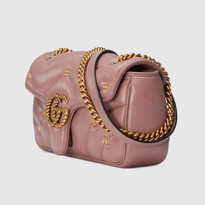 The GG Marmont shoulder bag presents a softly padded version of the rose beige GG Matelasse leather with small Double G studs, and a twisted torchon Double G embellishment. The sliding chain strap smoothly transforms from a single shoulder length to a doubled top handle length for multiple ways to wear the bag..