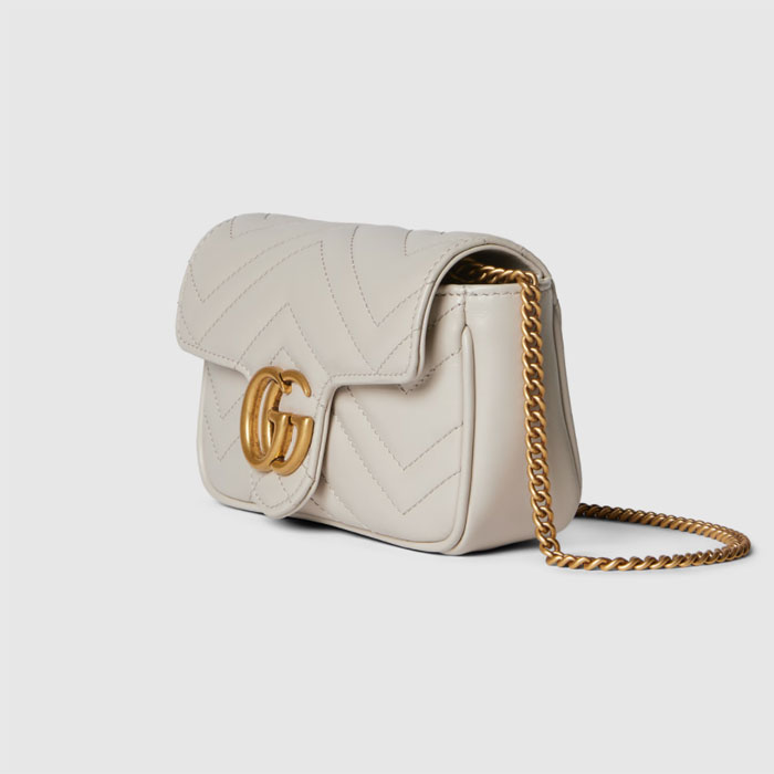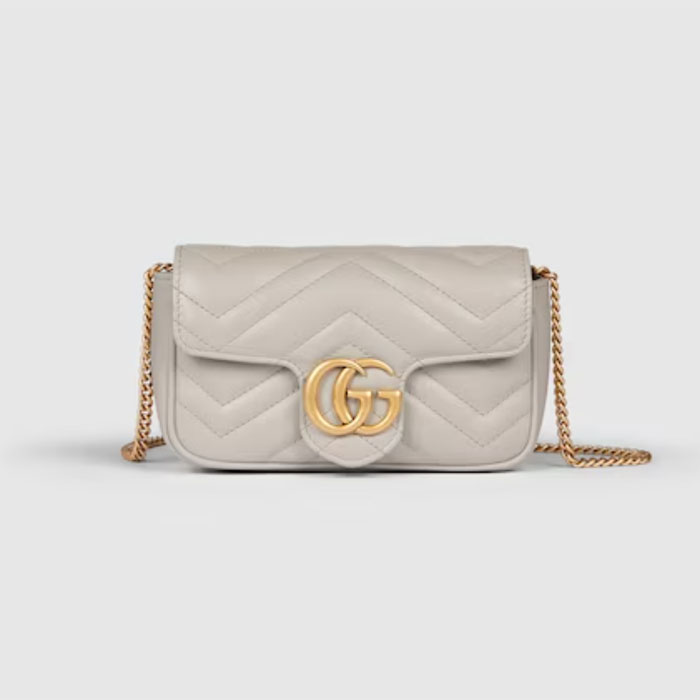 Crafted from ligt grey matelass茅 chevron leather, this super mini bag is defined by the emblematic Double G logo in antique gold-toned hardware. A key ring that can be used to attach the accessory to a separate bag completes the style.