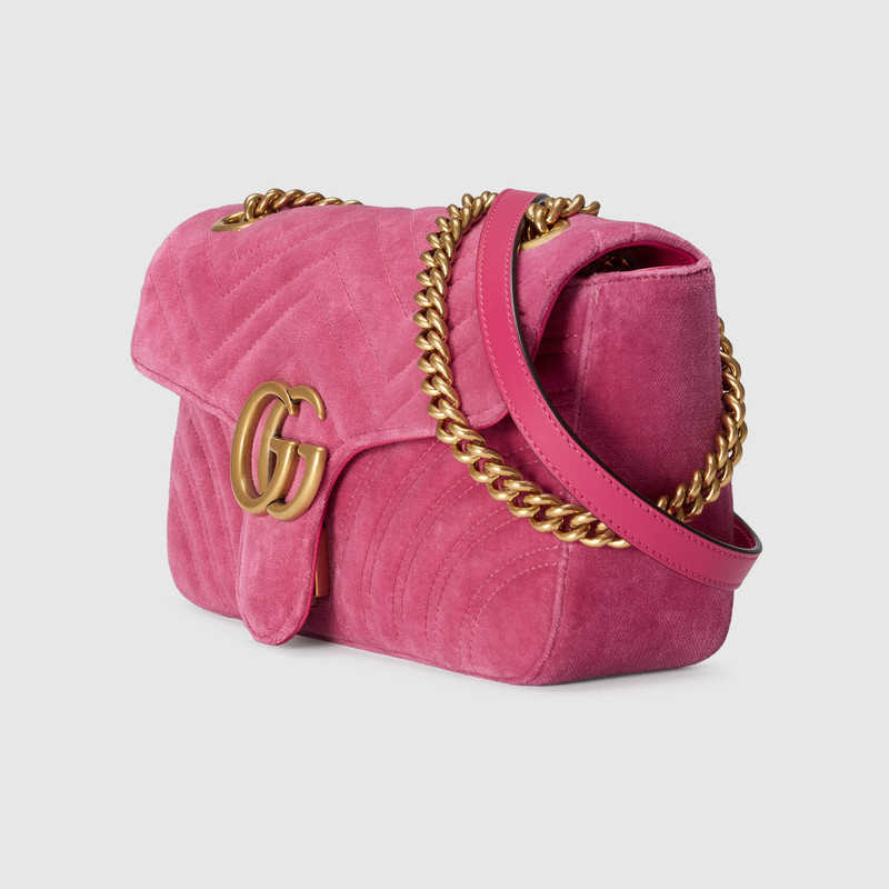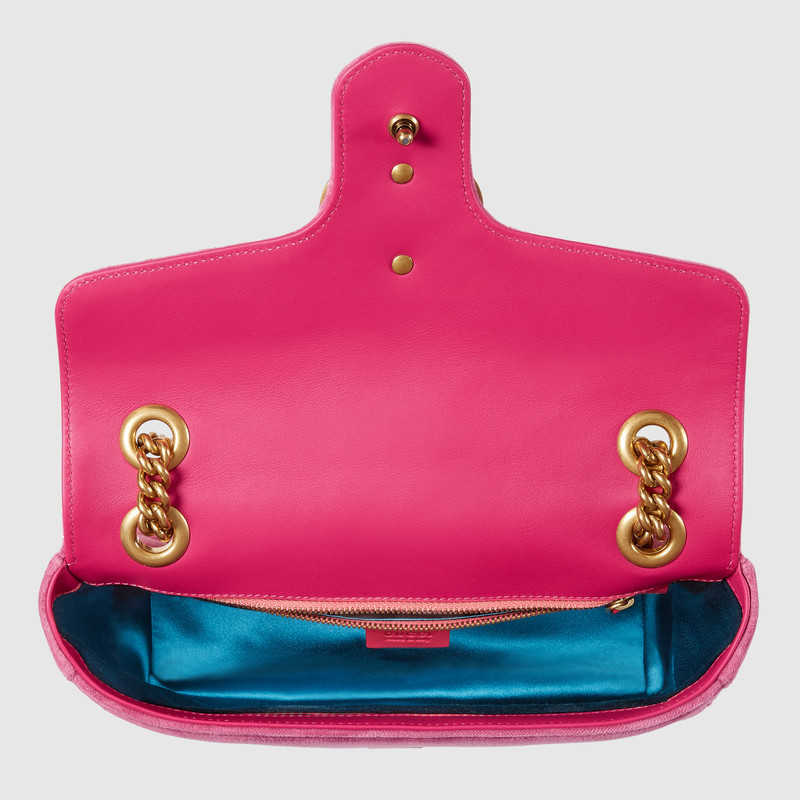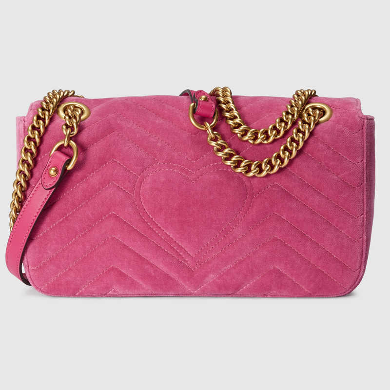 The small GG Marmont chain shoulder bag has a softly structured shape and an oversized flap closure with Double G hardware. The sliding chain strap can be worn multiple ways, changing between a shoulder and a top handle bag. Made in matelass茅 chevron velvet with a plush hand and rich finish.