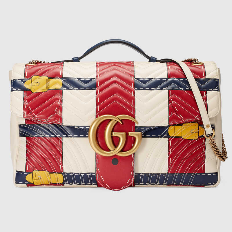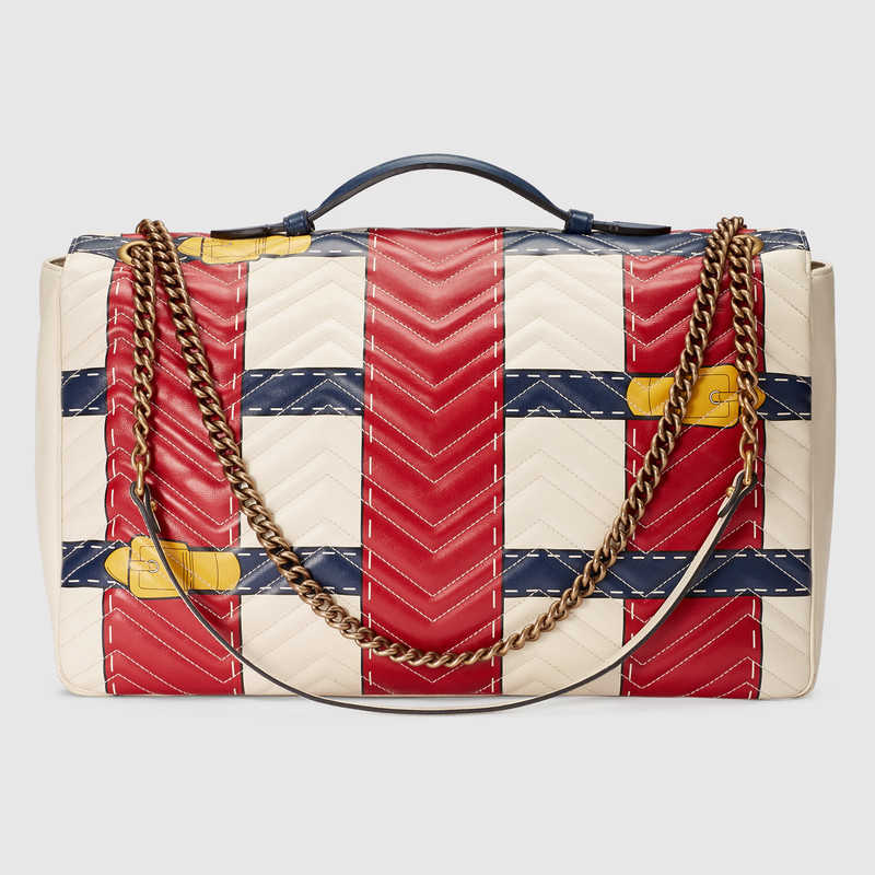 The GG Marmont maxi chain shoulder bag has a softly structured oversize shape with Double G hardware. The chain shoulder strap has a leather shoulder detail. The printed design gives a three-dimensional effect of overlapping belts with buckles. Made in a quilted plump, extremely soft leather with a natural rich appearance that is ideal for printed patterns.