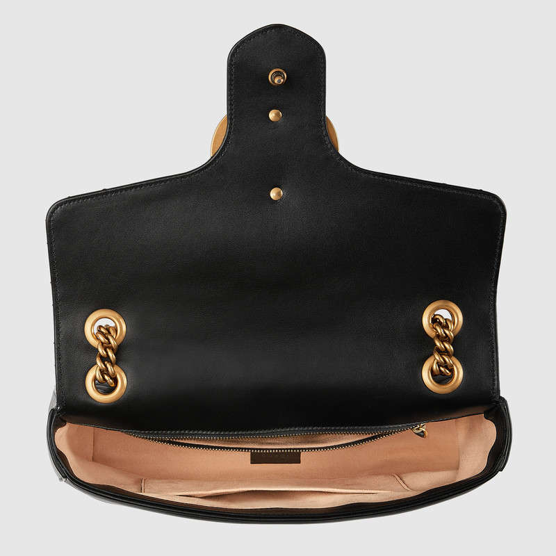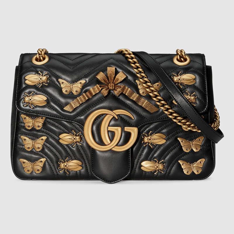Animals thrive in the Alchemist's Garden-a magical wellspring of signs and symbols that influence the Fall Winter 2017 collection. Metal cicadas and moths appear on the medium GG Marmont shoulder bag, designed with a softly structured shape and an oversized flap closure with Double G hardware. The sliding chain strap can be worn multiple ways, changing between a shoulder and a top handle bag. Made in matelasse chevron leather with a heart on the back.