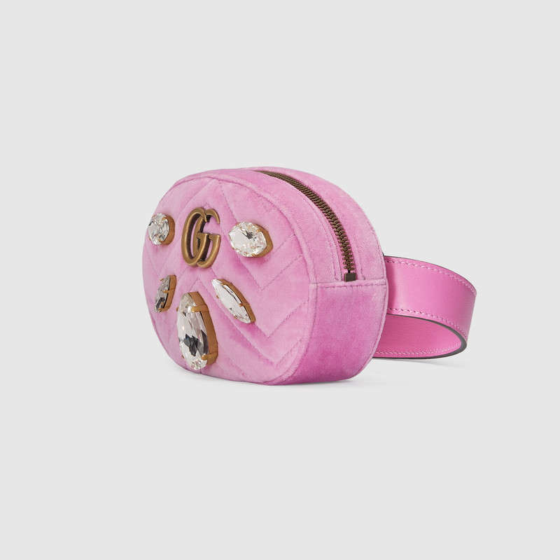 Featuring a rounded shape with a retro 90s sportswear-inspired influence, the GG Marmont belt bag is crafted in plush velvet with a stitched chevron pattern. The leather belt is designed so the bag can be worn high on the waist. Finished with the recognizable Double G detail鈥攁n archival play on the Running G.