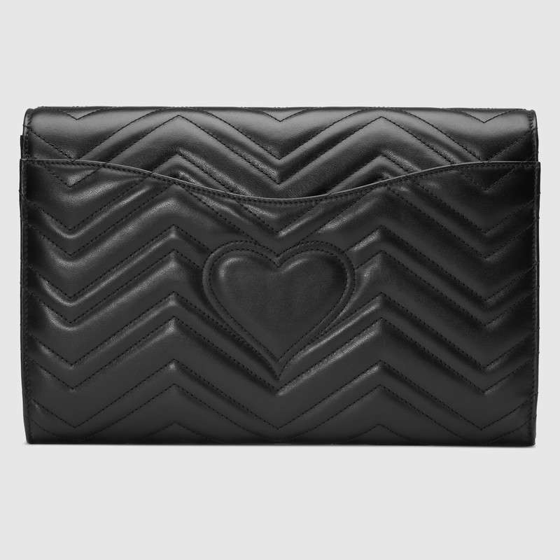 The GG Marmont clutch has a softly structured shape with open back pocket and an oversized flap closure with Double G hardware. Made in matelasse chevron leather with a heart on the back.