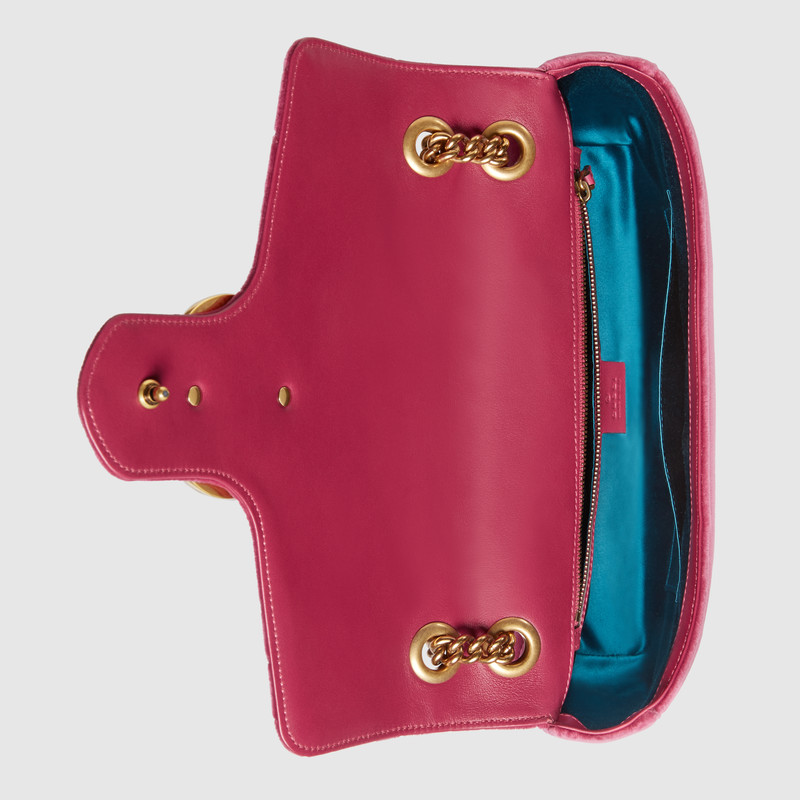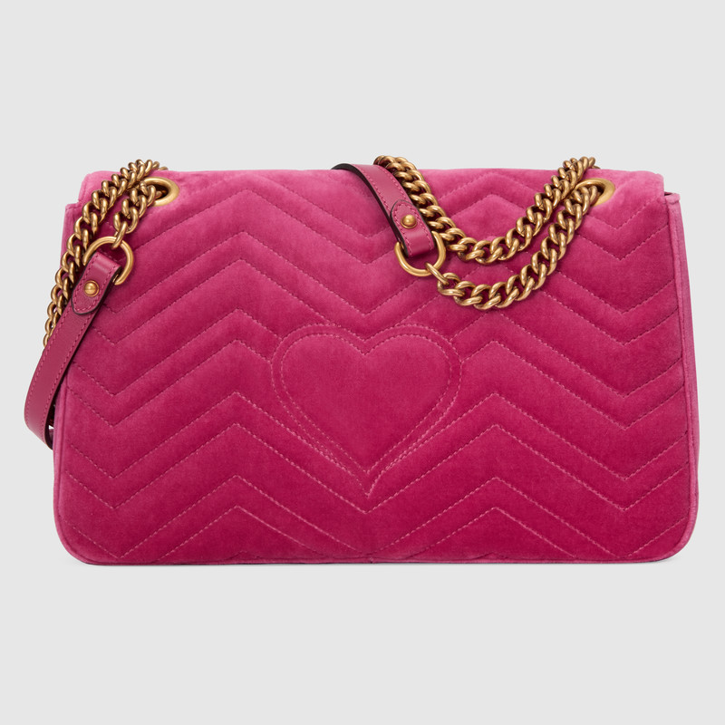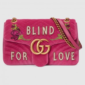 The medium GG Marmont chain shoulder bag has a softly structured shape and an oversized flap closure with Double G hardware. The sliding chain strap can be worn multiple ways, changing between a shoulder and a top handle bag. Made in chevron velvet with embroidered flower and "Blind For Love" appliques.