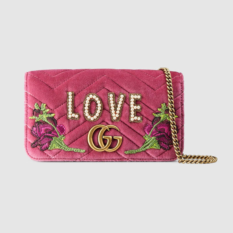 The GG Marmont chain mini bag has a softly structured shape and oversized flap closure with Double G and "Love" applique, embroidered using small beads and pearls. Made in plush chevron velvet.