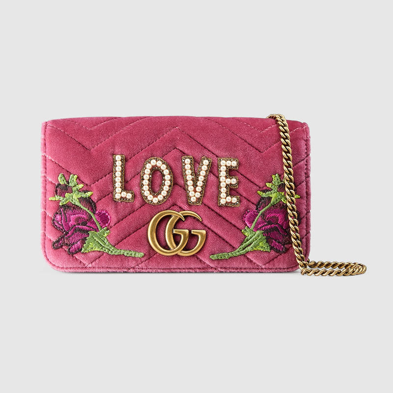 The GG Marmont chain mini bag has a softly structured shape and oversized flap closure with Double G and "Love" appliqu茅, embroidered using small beads and pearls. Made in plush chevron velvet.