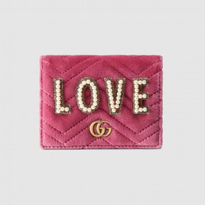A GG Marmont wallet in plush velvet with "Love" applique, embroidered using small beads and pearls.