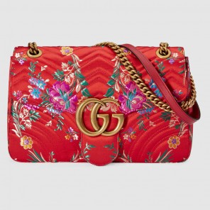 The medium GG Marmont chain shoulder bag has a softly structured shape and an oversized flap closure with Double G hardware. The sliding chain strap can be worn multiple ways, changing between a shoulder and a top handle bag. Made in a new floral jacquard fabric with colorful flowers on a red background.