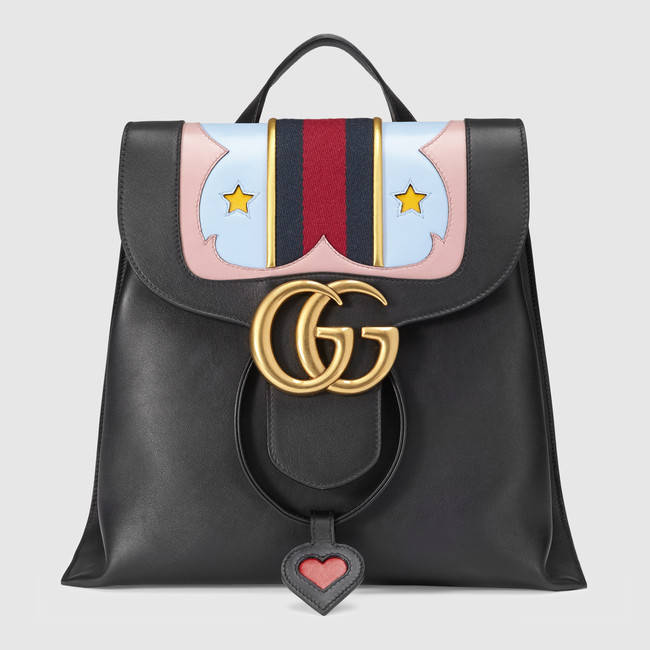 A GG Marmont leather backpack with Western details on the front flap and a heart leather tab on the end of the adjustable pull.
