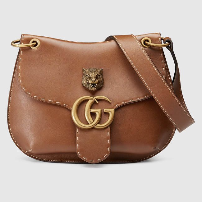 A feline metal detail sits on the front of this structured leather shoulder bag with contrast stitching detail.