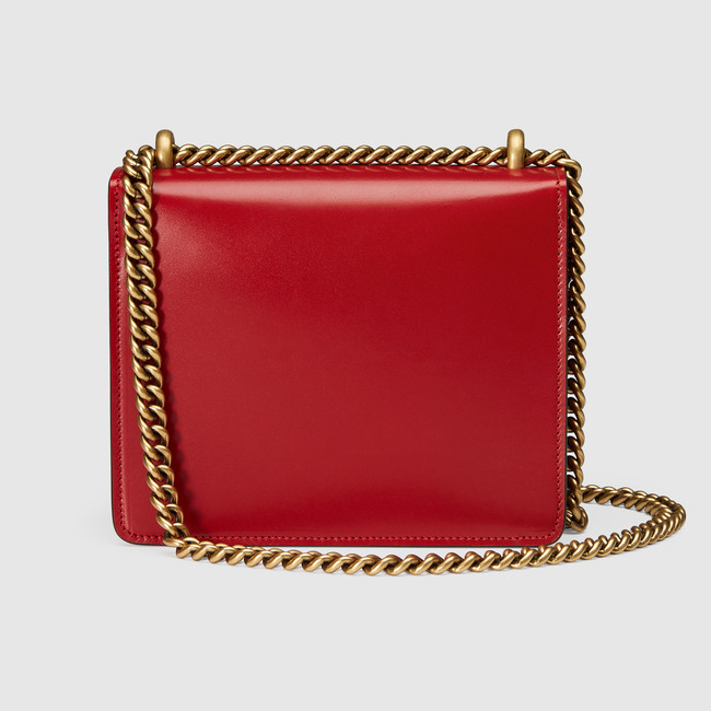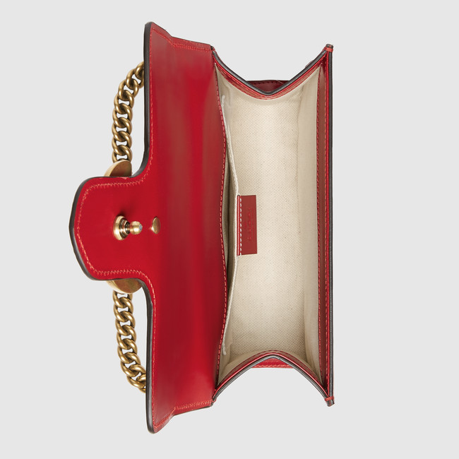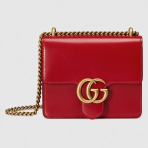 The small GG Marmont chain shoulder bag has a structured shape and oversized flap closure completed with our Double G hardware. The sliding chain strap can be worn multiple ways, changing between a shoulder and a top handle bag. Made in our shiny leather with an intense appearance, the firm compact feel of this leather is ideal for structured bags.