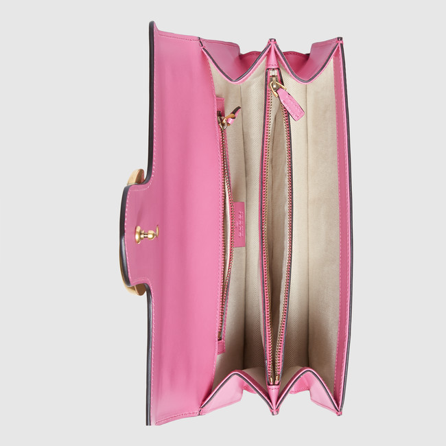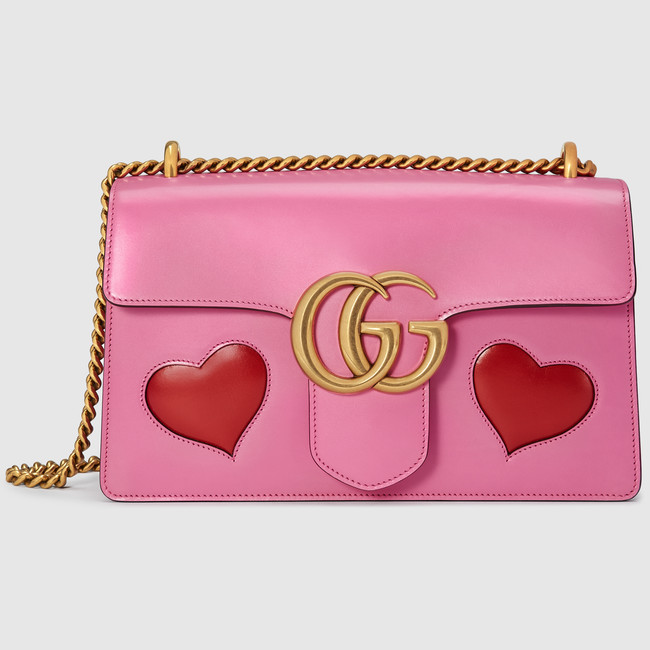 The medium GG Marmont chain shoulder bag has a structured shape and oversized flap closure completed with our Double G hardware. The sliding chain strap can be worn multiple ways, changing between a shoulder and a top handle bag. Made in our shiny leather with an intense appearance, the firm compact feel of this leather is ideal for structured bags.
