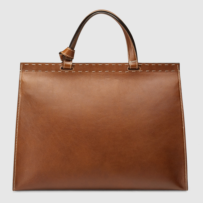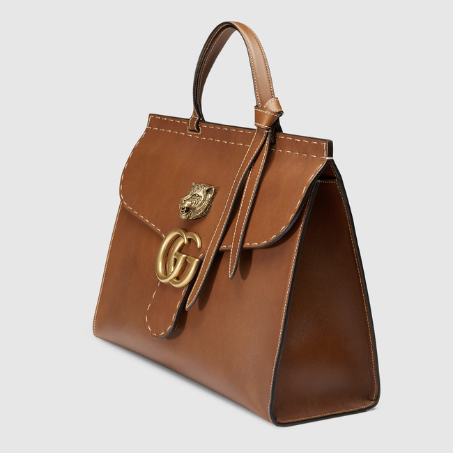 A feline metal detail sits on the front of this structured leather tote with contrast stitching detail.