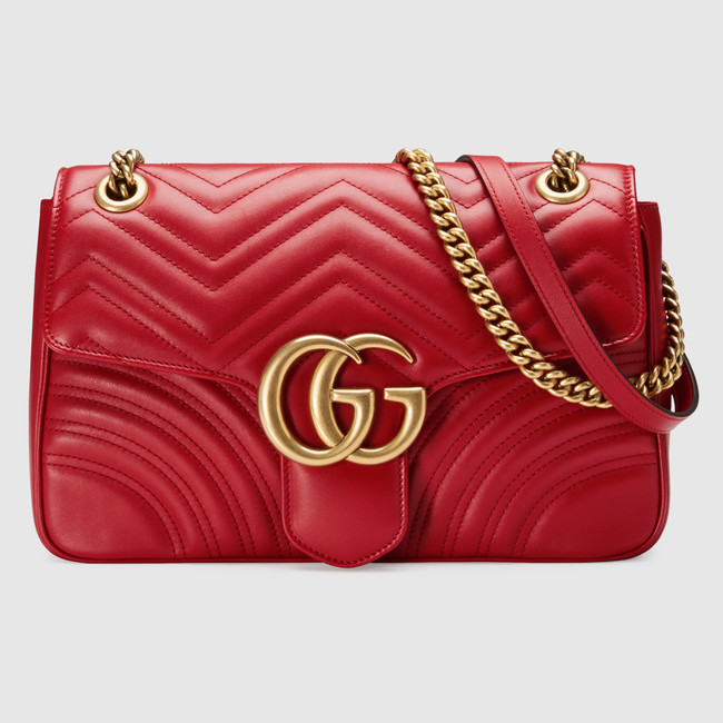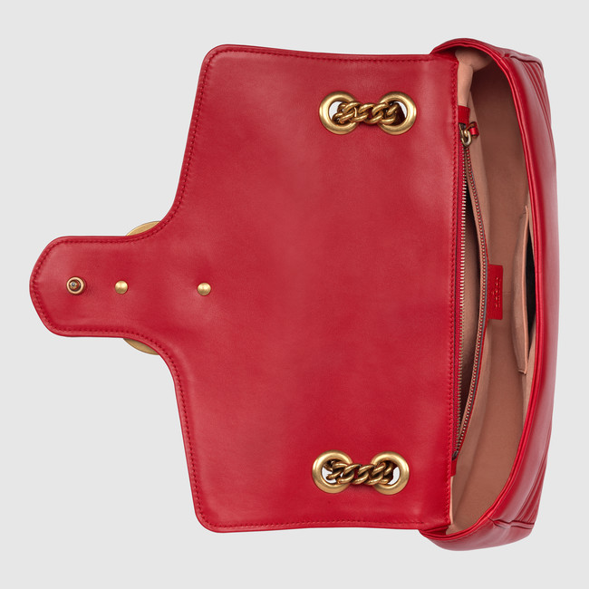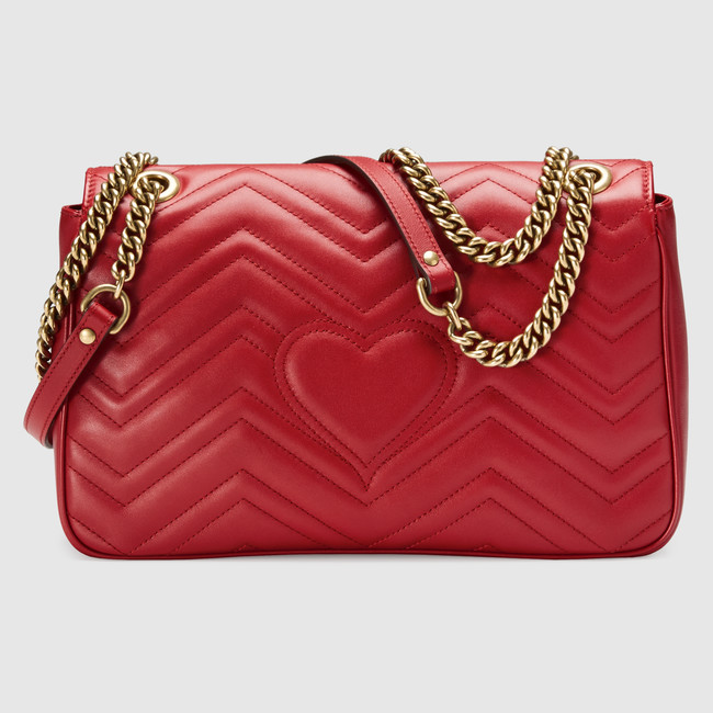 The medium GG Marmont chain shoulder bag has a softly structured shape and an oversized flap closure with Double G hardware. The sliding chain strap can be worn multiple ways, changing between a shoulder and a top handle bag. Made in matelasse chevron leather with a heart on the back.