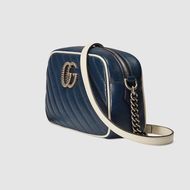 The small GG Marmont chain shoulder bag has a softly structured shape and a zip top closure with the Double G hardware. Reintroduced in Cruise 2020, made from blue diagonal matelasse leather and completed with a twisted torn Double G embellishment. The shape is highlighted in contrast leather and completed with a chain shoulder strap.