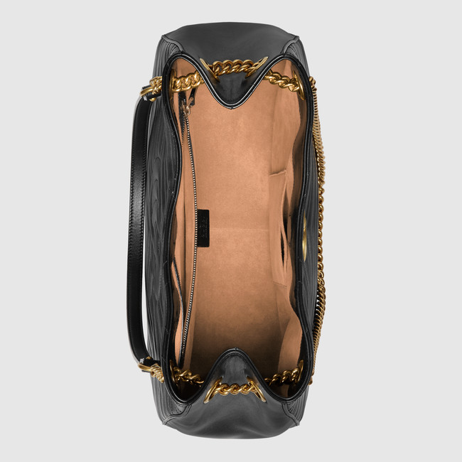 The medium GG Marmont chain shoulder bag has a softly structured shape with Double G hardware. The chain shoulder strap has a leather shoulder detail. Made in matelasse leather with a chevron design and GG on the back.