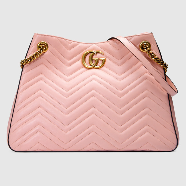 The medium GG Marmont chain shoulder bag has a softly structured shape with Double G hardware. The chain shoulder strap has a leather shoulder detail. Made in matelasse leather with a chevron design and GG on the back.