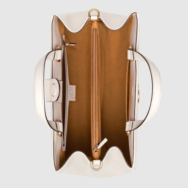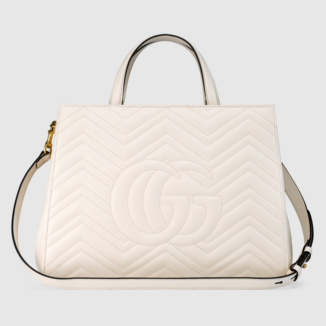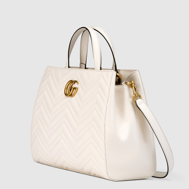 The medium GG Marmont top handle bag has a softly structured shape with hidden magnet closure and a smaller version of the Double G hardware. Made in matelasse leather with a chevron design and GG on the back.