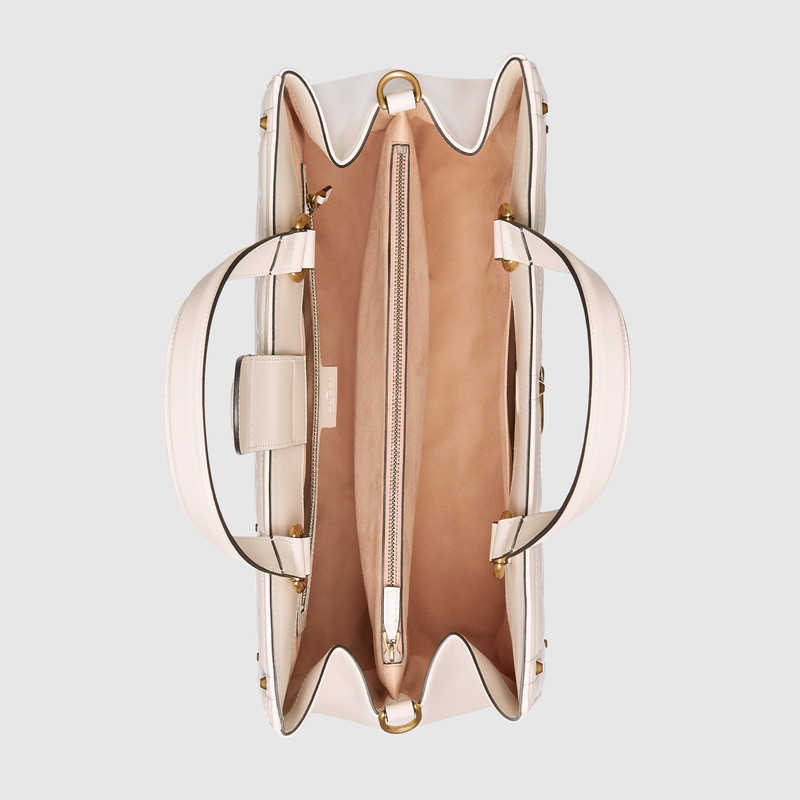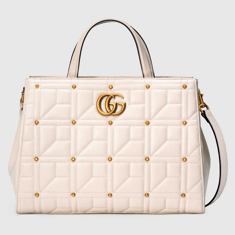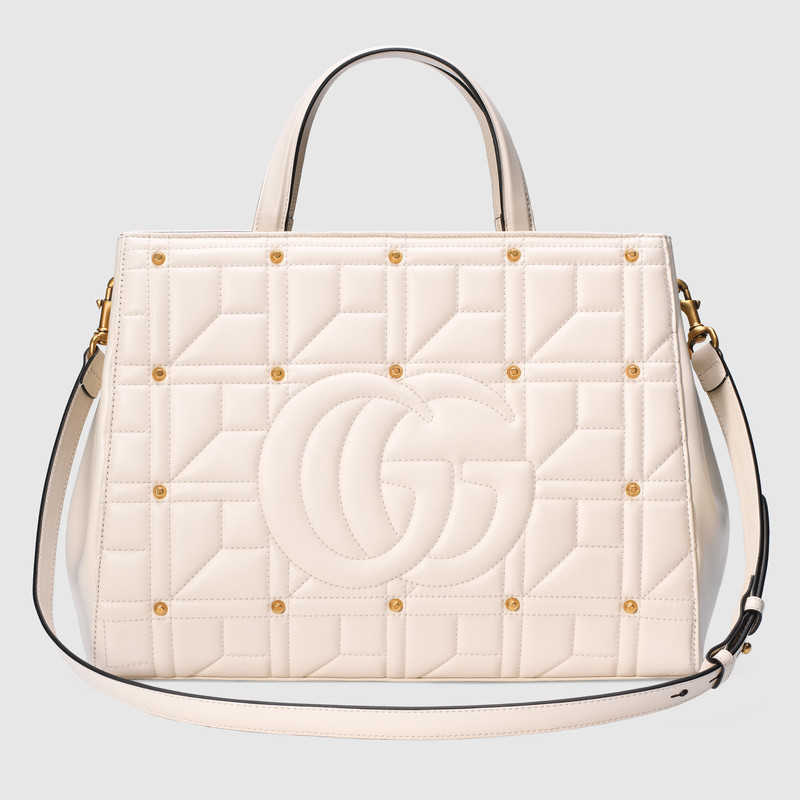 The medium GG Marmont top handle bag has a softly structured shape with hidden magnet closure and a smaller version of the Double G hardware. Made in matelasse leather with a cubic pattern and studs.