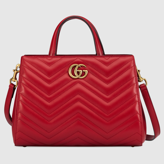 The small GG Marmont top handle bag has a softly structured shape with hidden magnet closure and a smaller version of the Double G hardware. Made in matelasse leather with a chevron design and GG on the back.