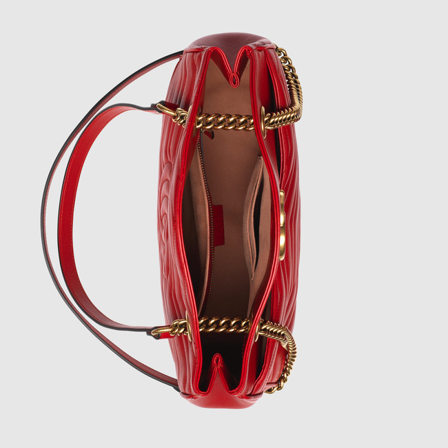 The medium GG Marmont chain tote bag has a softly structured shape and a covered magnet closure with Double G hardware. The chain shoulder straps have a leather shoulder detail. Made in matelasse leather with a chevron design and GG on the back.