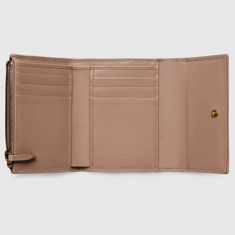 The GG Marmont matelasse chevron leather wallet. The snap button wallet has six card slots, three open pockets, a bill compartment and zip pocket for change.