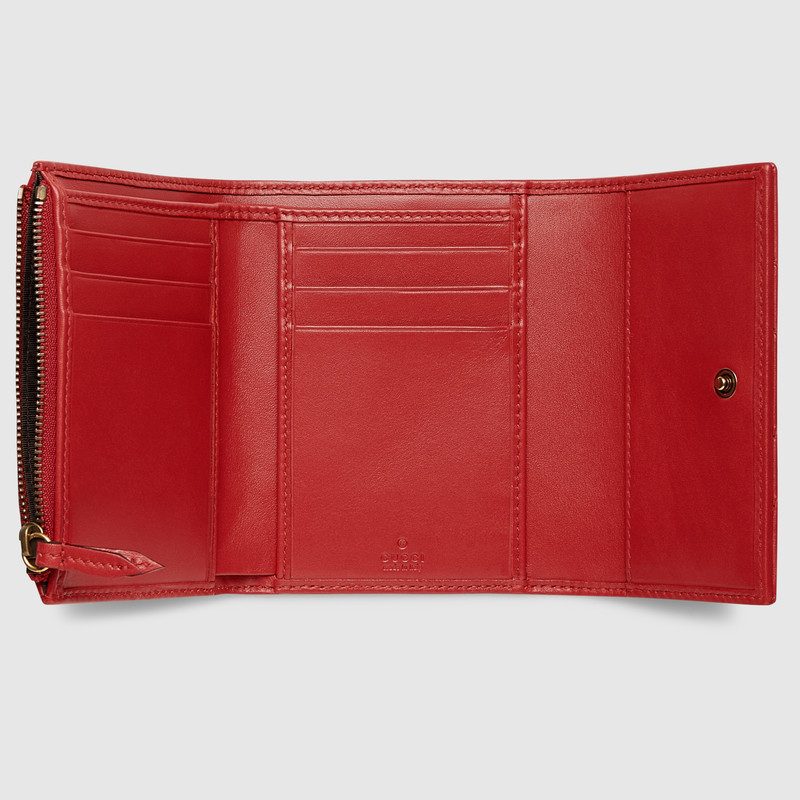 The GG Marmont matelasse chevron leather wallet. The snap button wallet has six card slots, three open pockets, a bill compartment and zip pocket for change.