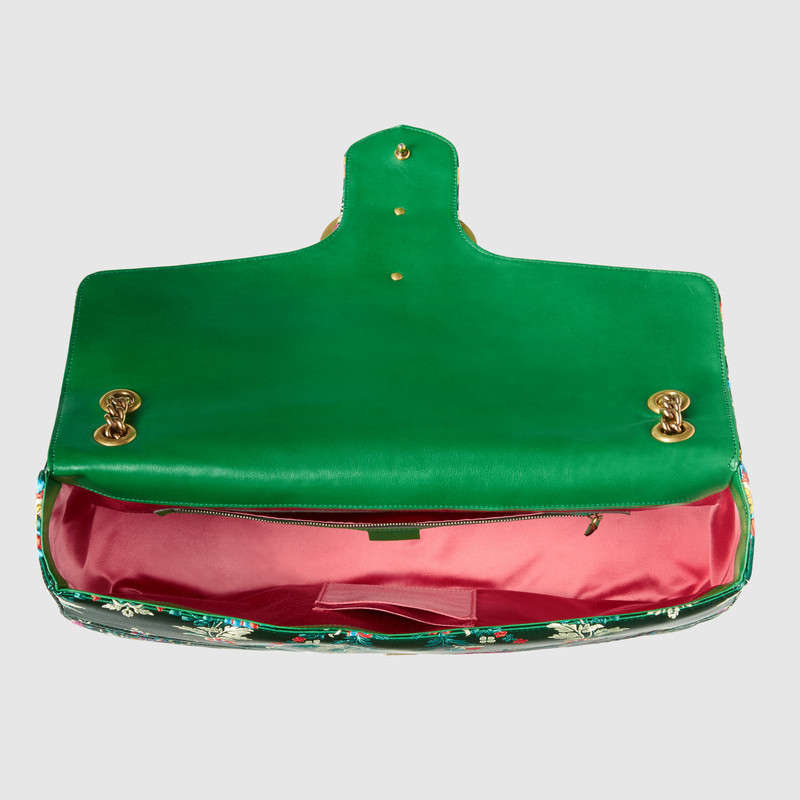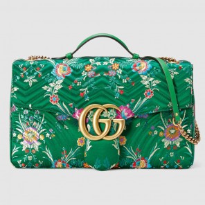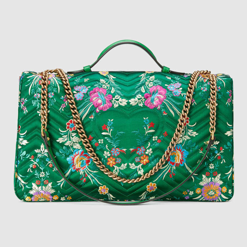 The GG Marmont maxi chain shoulder bag has a softly structured oversize shape and an oversized flap closure with Double G hardware. The sliding chain strap can be worn multiple ways, changing between a shoulder and a top handle bag. Made in a new floral jacquard fabric with colorful flowers on a green background.