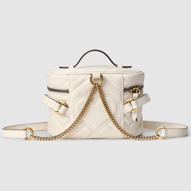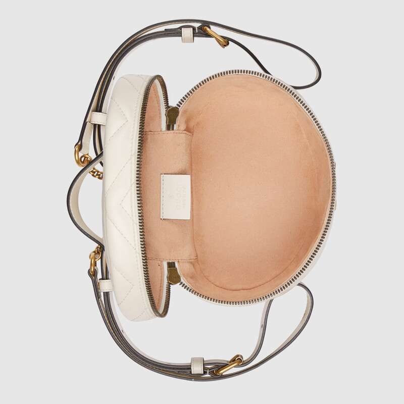 The mini backpack has a contemporary rounded shape in white matelasse leather, completed with chain shoulder straps and a top handle. Part of the GG Marmont collection, the style is defined by the three-dimensional Double G hardware鈥攁n archival-inspired stylizing of the initials of the House.