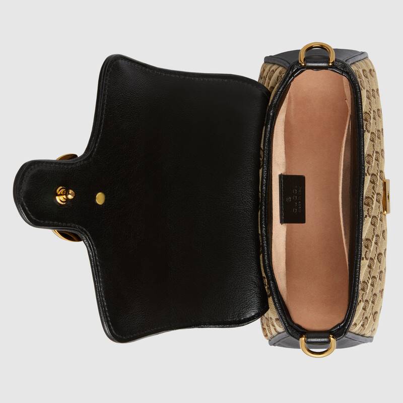 The GG Marmont bag is reimagined for Spring Summer 2020, made from diagonal matelasse quilted Original GG canvas and completed with a Double G embellishment. The mini top handle's distinct softly structured shape is outlined in contrast black piping, highlighting its flap closure. A removable chain strap allows the satchel shape to also be worn as a shoulder bag.