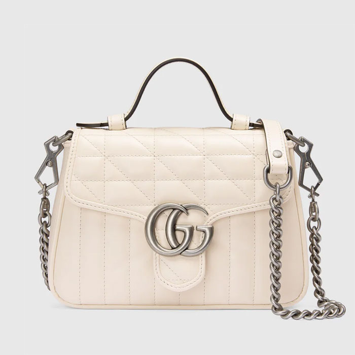 Gucci Aria explores the House's archives, telling Gucci's story though a mix of archival and contemporary elements. The GG Marmont was introduced in one of the Creative Director's first fashion shows and each season its design evolves through the lens of the latest collection. Here, the mini bag is presented in soft white matelass茅 leather with antique silver-toned hardware.
