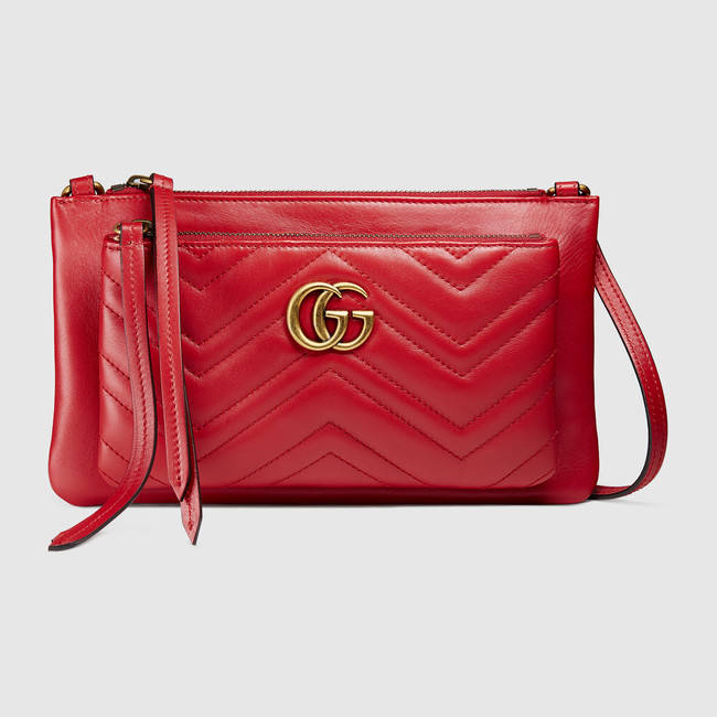 A new shape from the GG Marmont collection, this leather shoulder bag feathers a small detachable pouch made in matelasse leather with a chevron design.