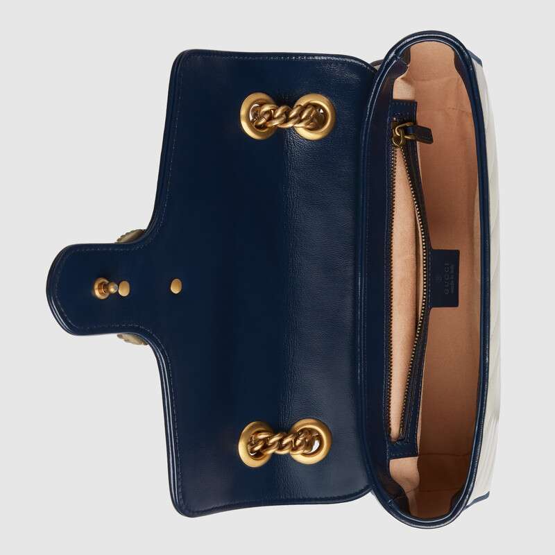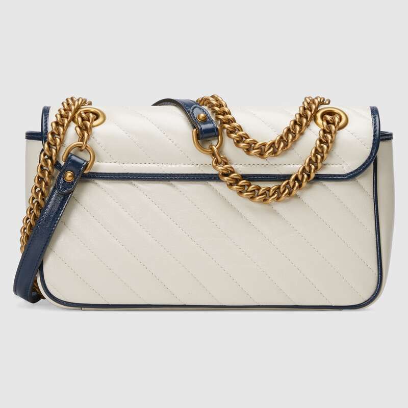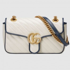 The GG Marmont bag is introduced in white diagonal matelasse quilted leather for Pre-Fall 2020, completed with a twisted torchon Double G embellishment. The small chain shoulder bag's distinct softly structured shape is outlined in contrast dark blue piping, highlighting its flap closure. The sliding chain strap smoothly transforms from a single shoulder length to a doubled top handle length for multiple ways to wear the bag.