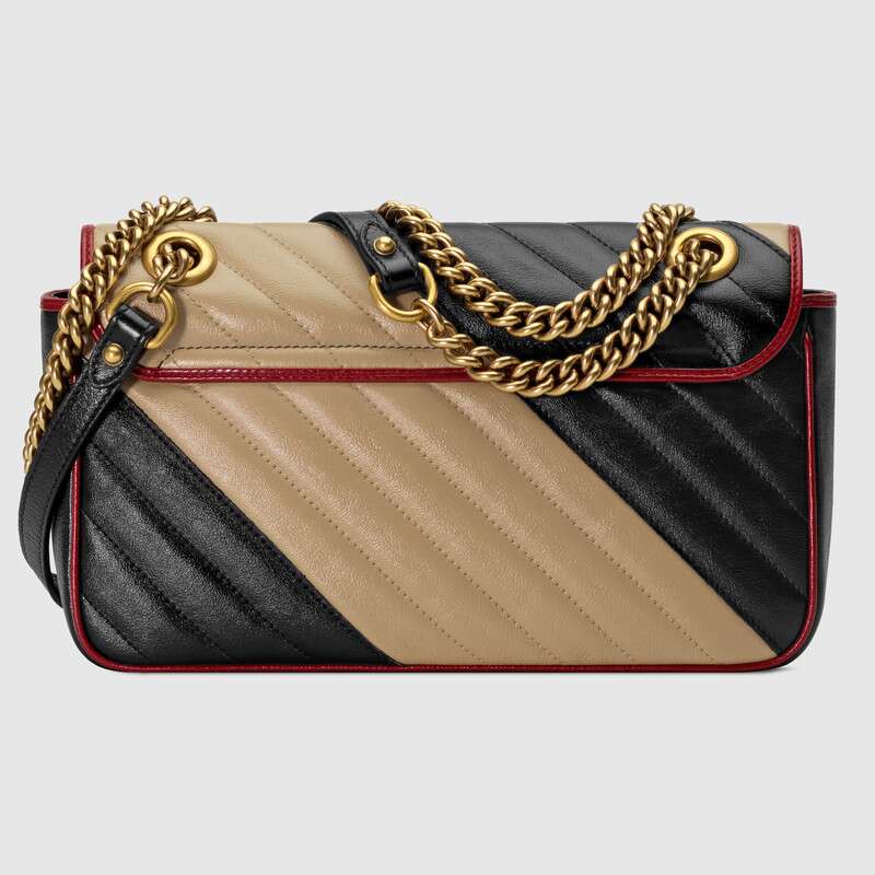 The GG Marmont small shoulder bag is reimagined in black and beige diagonal matelass茅 quilted leather, speaking to the theme of bold stripes that runs throughout the Pre-Fall 2019 collection. Completed with a twisted torchon Double G embellishment, the small chain shoulder bag's distinct softly structured shape is outlined in contrast cerise piping, highlighting its flap closure. The sliding chain strap smoothly transforms from a single shoulder length to a doubled top handle length for multiple ways to wear the bag.
