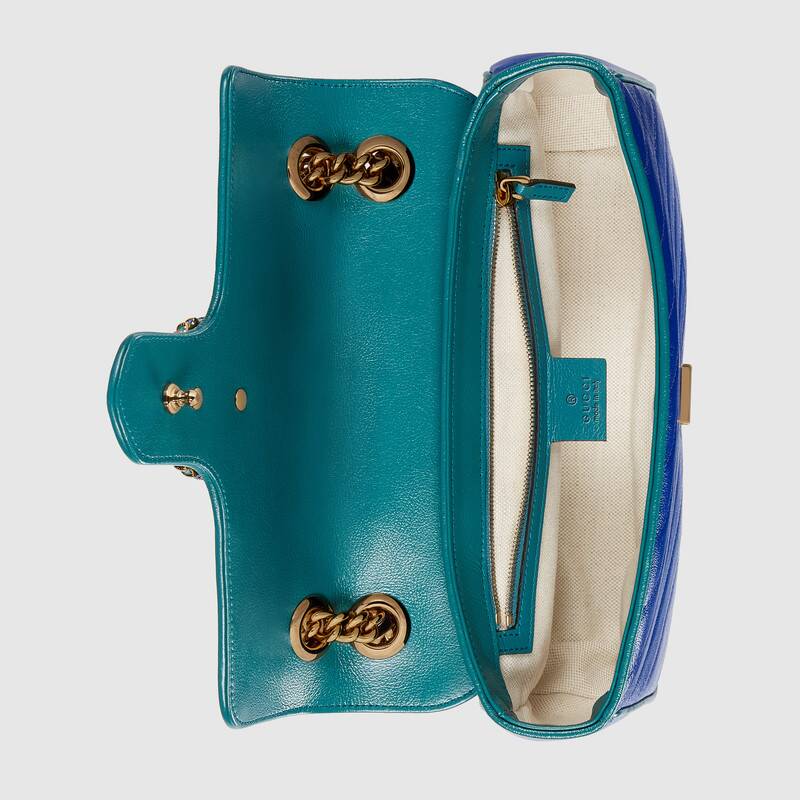 Signature styles from the Beloved lines are presented in vibrant colors that recall precious gems. Here the GG Marmont is introduced in sapphite toned blue leather with a diagonal matelass茅 finish. The shoulder bag is completed by its signature Double G hardware, enhanced by tonal enamel details.