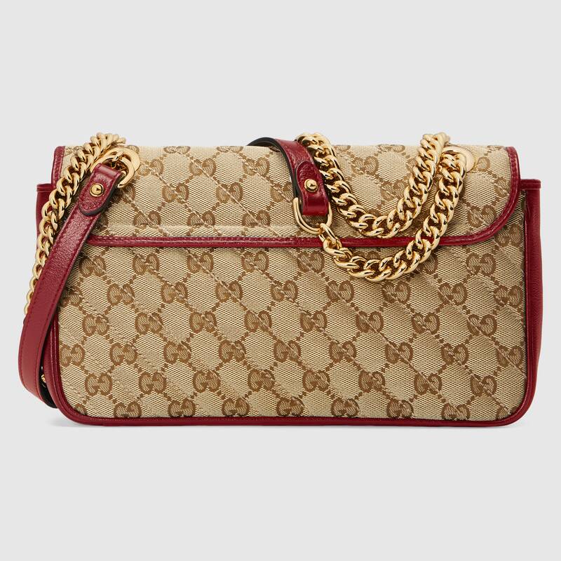 A statement Gucci accessory, reimagined with a strong logo connotation for Spring Summer 2020. Defined by the archival Double G hardware from the '70s, the GG Marmont bag is presented in diagonal matelass茅 Original GG canvas鈥攁 timeless pairing that pays homage to the House's heritage. The small chain shoulder bag's distinct softly structured shape is outlined in contrast red leather trims, highlighting its flap closure. The sliding chain strap smoothly transforms from a single shoulder length to a doubled top handle length for multiple ways to wear the bag.