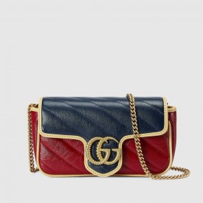 A part of the House's Beloved lines, the GG Marmont is introduced in deep shades of blue and red. A take on an archival symbol from the '70s, a textured version of the Double G completes the super mini bag.
