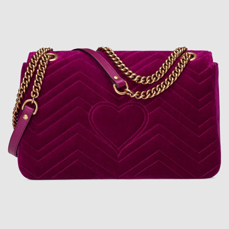 The medium GG Marmont chain shoulder bag has a softly structured shape and an oversized flap closure with Double G hardware. The sliding chain strap can be worn multiple ways, changing between a shoulder and a top handle bag. Made in embroidered chevron velvet with a heart on the back.