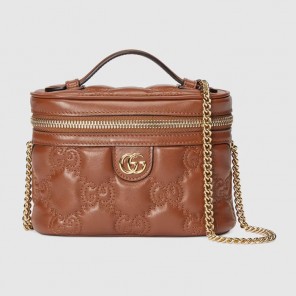 Matelasse leather is a signature material of the House, thanks to its super soft finish. The textured geometric motif defines a selection of small leather accessories, including this light brown top handle mini bag. The Double G hardware decorates the front, continuing the logo feel of the design.
