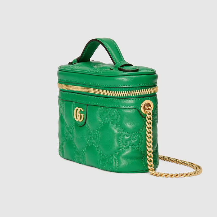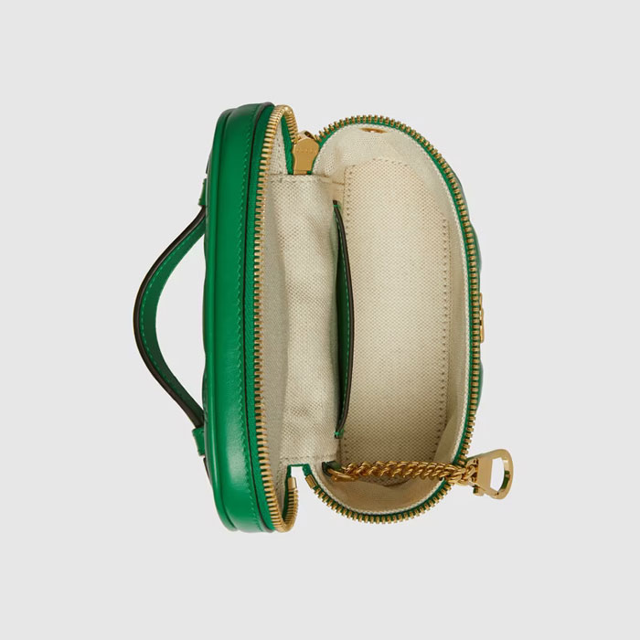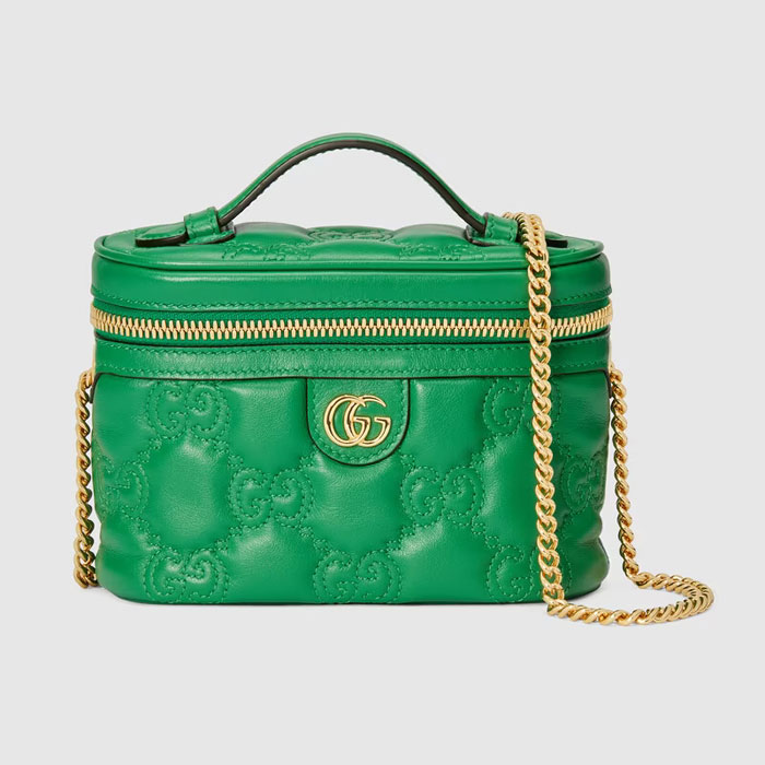 Matelasse leather is a signature material of the House, thanks to its super soft finish. The textured geometric motif defines a selection of small leather accessories, including this green top handle mini bag. The Double G hardware decorates the front, continuing the logo feel of the design.